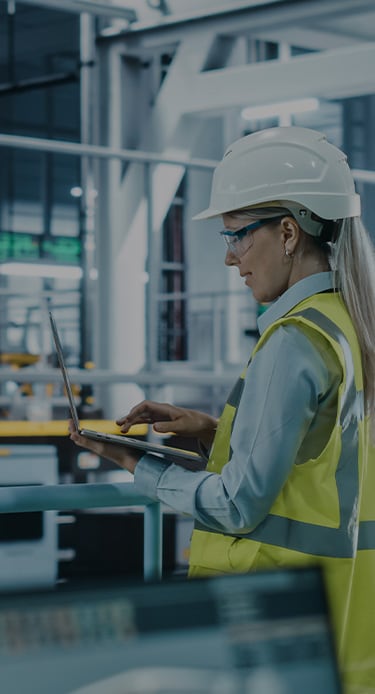A woman technician working on a computer in a fab Engineer in safety vest and helmet working on tablet in advanced electronics manufacturing facility