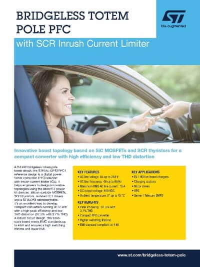 Controlled by an STM32F334 MCU specifically designed for digital power conversion applications, this reference design offers high performance in terms of efficiency, THD, power factor and reliability by controlling the inrush current at startup.