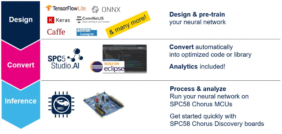 Thanks to the SPC5 plugin (SPC5-STUDIO-AI) running on the SPC5-STUDIO development environment, you can convert and import pretrained neural networks.