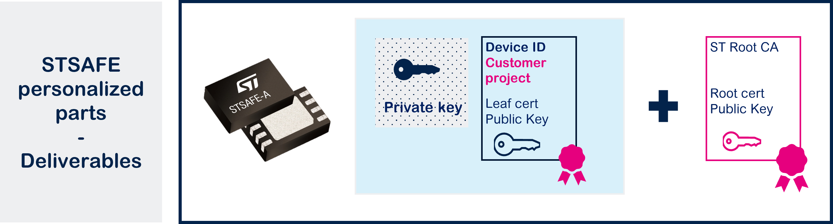 STSAFE personalization is the process of generating certificates and keys and personalizing them with customer-specific information. This personalization service enables customers to have their own certificates customized to match their specific needs.