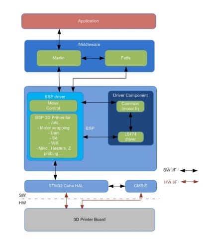 The firmware is organized into a drivers section with STM32Cube microcontroller and peripheral drivers, a middleware section with STM32Cube FatFs and Marlin algorithms for motion control, G-Codes, etc., and an application section with user command entry points.