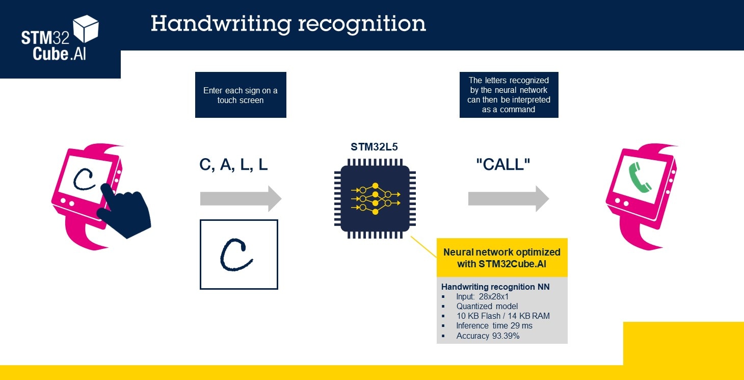- The demo runs on the STM32L562E discovery kit with an NN inference time for each character