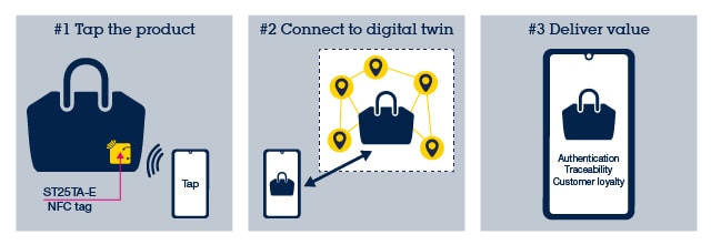 Seamlessly integrate a ST25TA-E tag into luxury products, and easily create a blockchain-secured digital twin to ensure product authenticity. The tag provides customers with trusted content such as a Digital Product Passport (DPP). A simple tap from a smartphone is all it takes for a customer to verify the authenticity of a product and gain access to personalized marketing content.