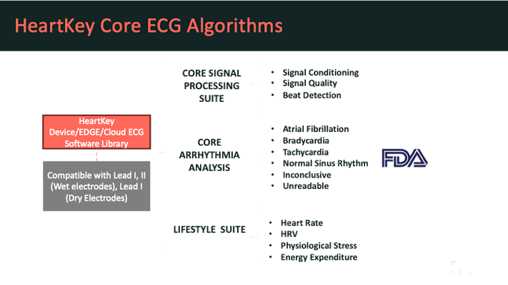 HeartKey® is our family of bio-sensing algorithms, with HeartKey® Core our powerful FDA-cleared suite of ECG algorithms and analytics that provide breakthrough levels of medical accuracy and efficiency in heart health through enhanced signal clarity, which is available today for deployment on chip, in the cloud, or “on prem”.