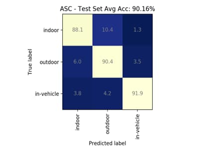 (30 x 32)ログメル・スペクトログラムを1024ms間隔でASC畳込みニューラル・ネットワーク入力に送ると、出力としてラベル(屋内、屋外、車内)を分類できます。