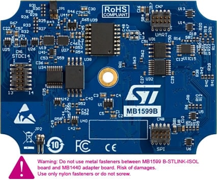 The B-STLINK-ISOL board is an additional module for STLINK-V3SET, performing galvanic isolation and voltage adaptation for STM32 microcontroller targets running below 3.3 V down to 1.65 V.