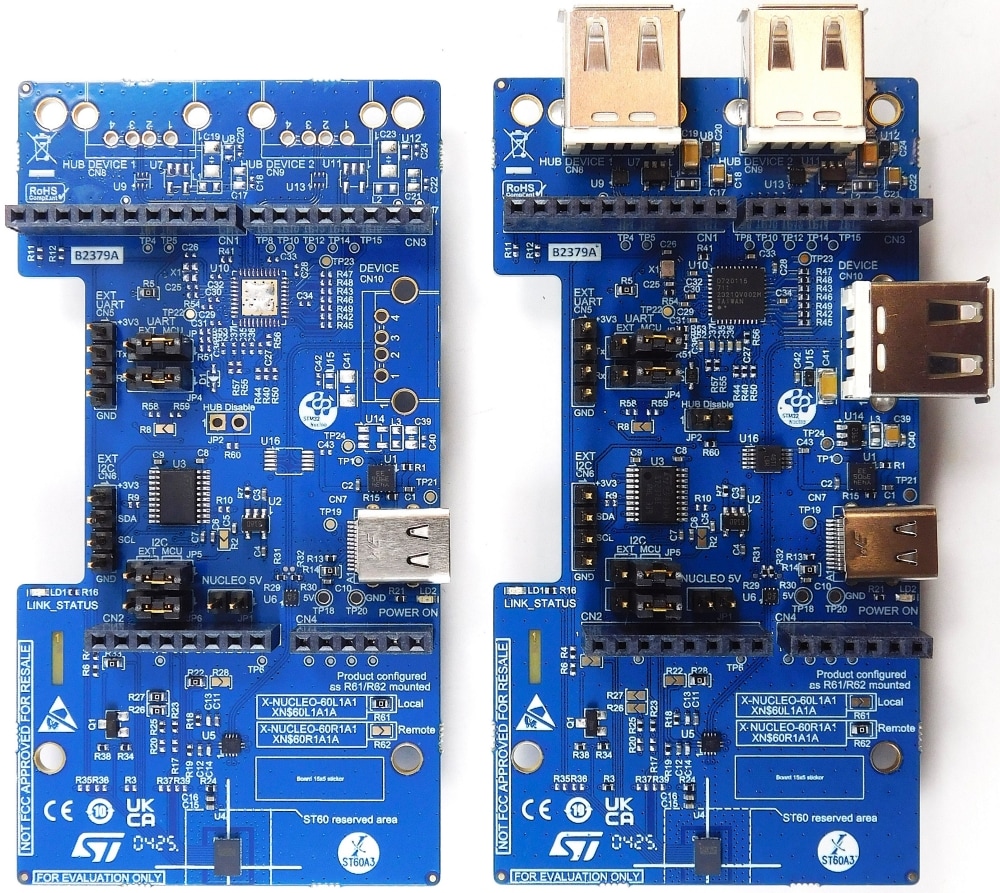 The X-NUCLEO-60L1A1 expansion board, which hosts an ST60A3H1 configured as Local is the only board needing to be plugged onto an STM32 Nucleo development board (for example, NUCLEO-L476RG with ultralow power STM32 microcontroller). The other X-NUCLEO-60R1A1 expansion board, which hosts an ST60A3H1 configured as Remote is used in standalone. Any ST60A3H1 configuration is done from the X-NUCLEO-60L1A1 side.