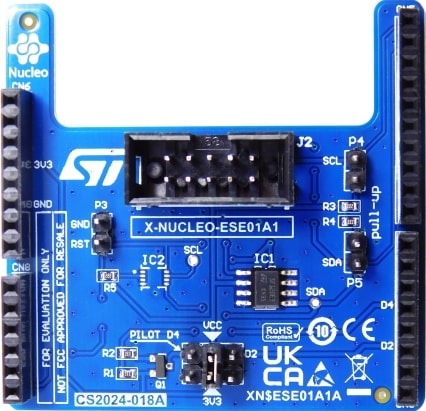 The X-NUCLEO-ESE01A1 expansion board is based on the STSAFE-A120 secure element. It can be used with any STM32 Nucleo development board.