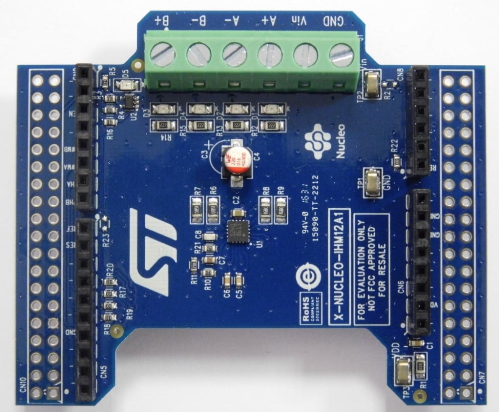 The X-NUCLEO-IHM12A1 is compatible with the Arduino UNO R3 connector and most STM32 Nucleo boards.