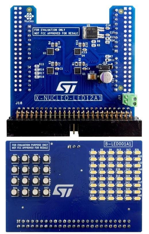 The X-NUCLEO-LED12A1 LED driver expansion board for STM32 Nucleo features four LED1202 devices that can drive up to 48 LEDs.