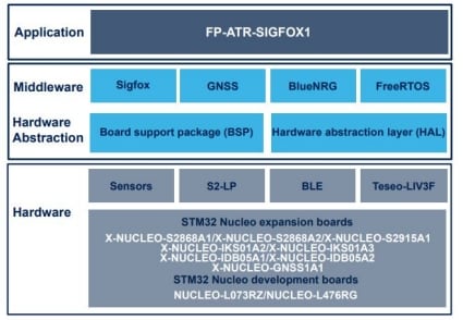 FP-ATR-SIGFOX1 runs on the STM32 microcontroller and includes drivers for the S2-LP ultra-low power RF transceiver, the Bluetooth Low Energy module, the motion, environmental and GNSS sensors.
