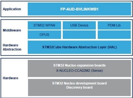 The software with the suggested combination of STM32WB and ST devices can be used, for example, to develop wireless audio communication systems for smart home or wearable applications.