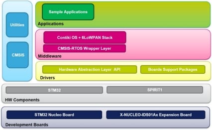 The osxContiki6LP add-on for the X-CUBE-SUBG1 expansion package implements the Contiki OS and Contiki 6LoWPAN stack 3.x on the STM32 microcontroller with ST’s SPIRIT1-based sub-1 GHz RF communication boards.