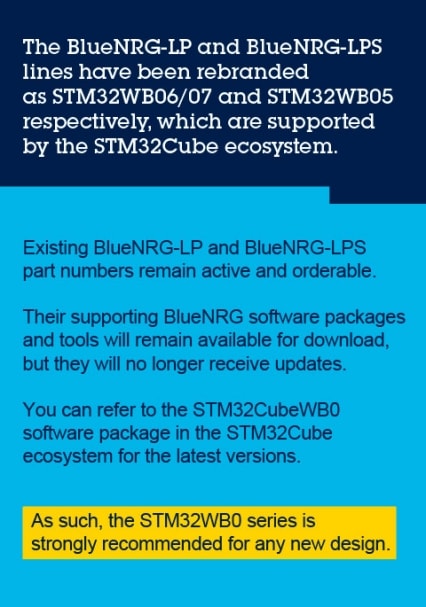 - SW package supporting BlueNRG-LP, BlueNRG-LPS Bluetooth® low energy (LE) systems-on-chip