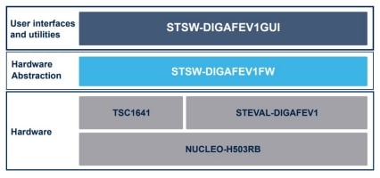 The STSW-DIGAFEV1FW implements the bridge feature between the TSC1641 device and the STSW-DIGAFEV1GUI SW, running on a PC.
