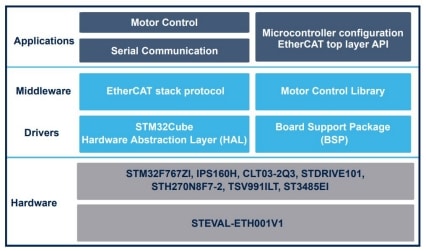 The STSW-ETHDRV01V1 firmware package for the STEVAL-ETH001V1 servo drive solution, implements position control algorithm with real-time communication running on the STM32F767ZI microcontroller. It can manage connectivity, servo drive actuation and digital input/output interface at the same time.