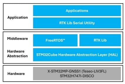 Positioning data is gathered using the X-STM32MP-GNSS1 expansion board, which incorporates the Teseo-LIV3FL module for low-power, multiconstellation GNSS positioning.