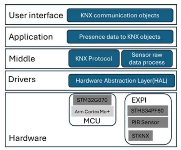 The STSW-KNXPSENSOR runs on the STDES-KNXPSENSOR presence sensor board.