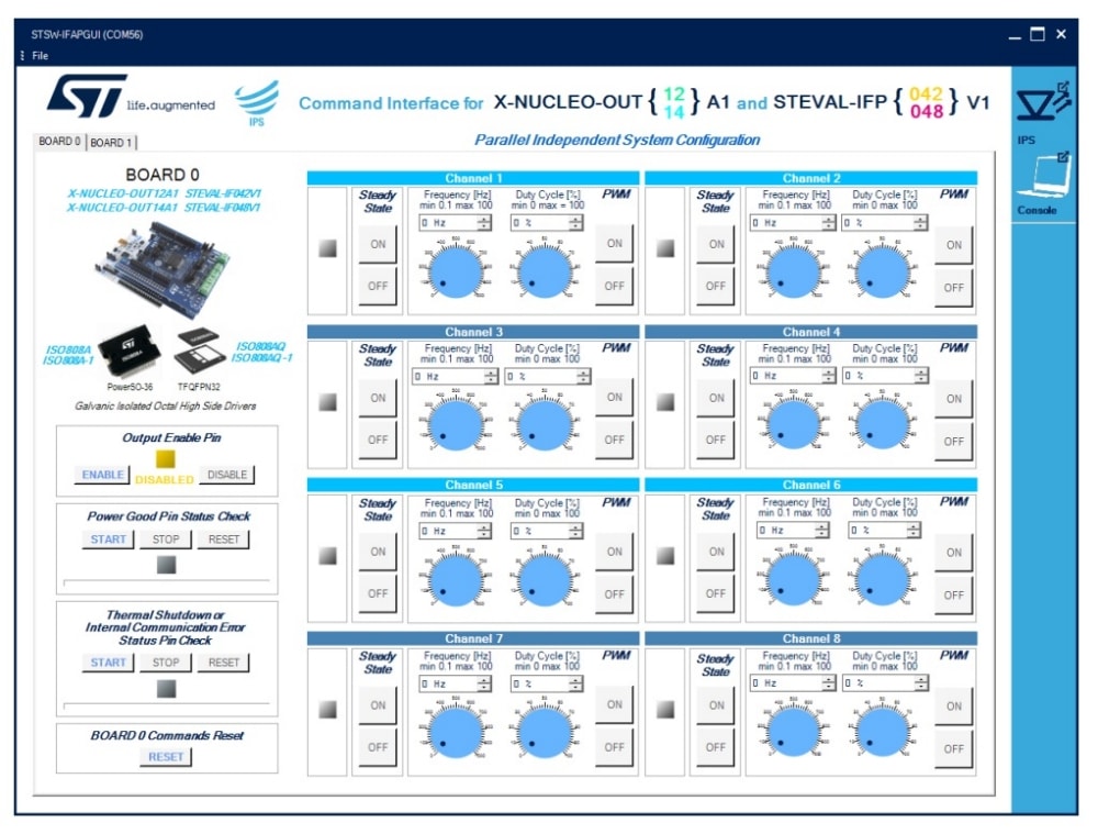 - Full control of the X-NUCLEO-OUT12A1 and X-NUCLEO-OUT14A1 expansion boards via the STSW-IFAPGUI graphical user interface