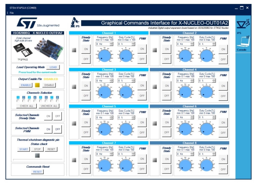 - Full control of the X-NUCLEO-OUT01A2 expansion board via the STSW-IFAPGUI graphical user interface
