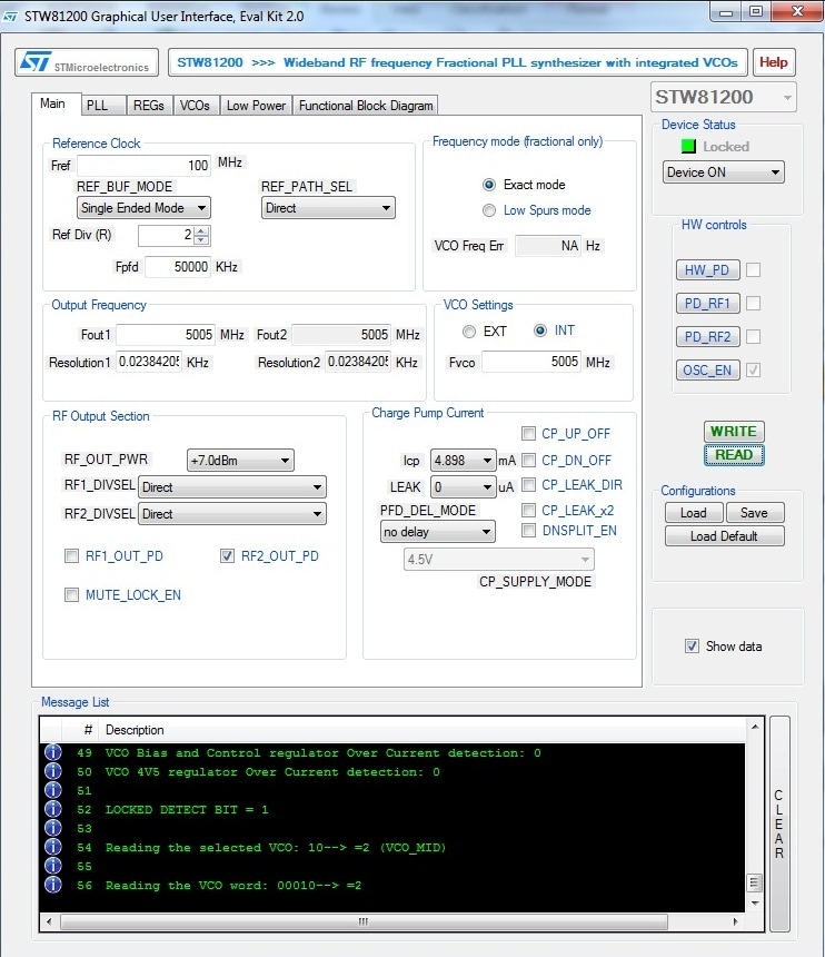 The kit includes PC-compatible software with a Graphical User Interface (STSW-RFSOL002) allowing the user to write and read all device registers. This gives direct control of circuit functions such as: operating frequency, reference frequency, input mode, charge pump current and low-power modes.