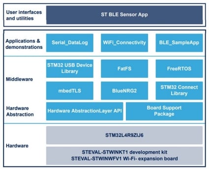 The STSW-STWINKT01 firmware package for the SensorTile Wireless Industrial Node (STWIN) development kit provides sample projects that you can use to develop custom predictive maintenance, smart industry, IoT and remote monitoring applications. The package is based on STM32Cube software technology, and includes all the low level drivers to manage the on-board devices and system-level interfaces.