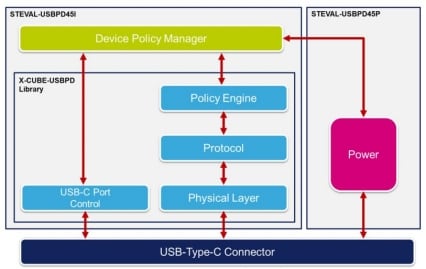 The STUSB1602A USB controller and X-CUBE-USB-PD software library running on STM32 microcontroller are USB Power Delivery specification rev 3.0 certified.
