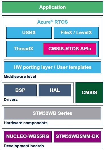 FreeRTOS™ and CMSIS RTOS V2 adaptation layers are included and demonstrated, making it easy and quick to migrate from FreeRTOS™ or another RTOS to Azure® RTOS ThreadX for STM32WB users.