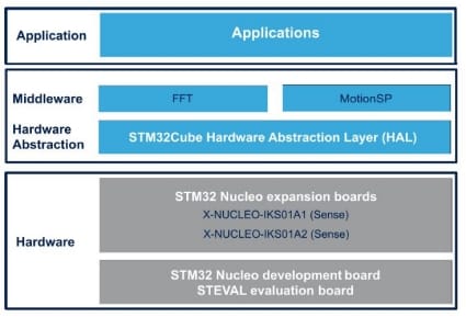 X-CUBE-MEMS-XT1 runs on the STM32 and includes drivers that recognize the sensors and collect temperature, humidity, pressure and motion data from the A3G4250D, AIS328DQ, AIS3624DQ, H3LIS331DL, HTS221, IIS2DLPC, IIS2MDC, ISM303DAC, ISM330DLC, LIS2DH12, LIS2DW12, LIS2MDL, LIS3MDL, LPS22HB, LPS22HH, LPS25HB, LPS33HW, LSM303AGR, LSM6DS0, LSM6DS3, LSM6DSL, LSM6DSO, LSM6DSR and LSM6DSL devices.