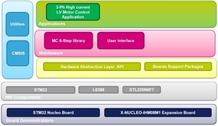 - Complete firmware package to build motor control applications based on L6398 gate drivers and STL220N6F7 Power MOSFETs (X-NUCLEO-IHM08M1).
