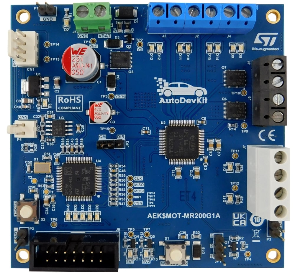 The AEK-MOT-MR200G1 hosts an SPC582B60E1 chorus 1M microcontroller and an L99DZ200G automotive-grade multioutput driver.