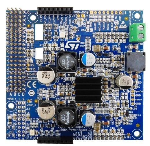 The AEK-POW-L5964V1 expansion board is designed for power car or truck body applications requiring different voltages, such as USB-PD or infotainment. It has two independent converters that can deliver a fixed or variable output voltage via MCU control. The output current can be up to 3 A per channel.
