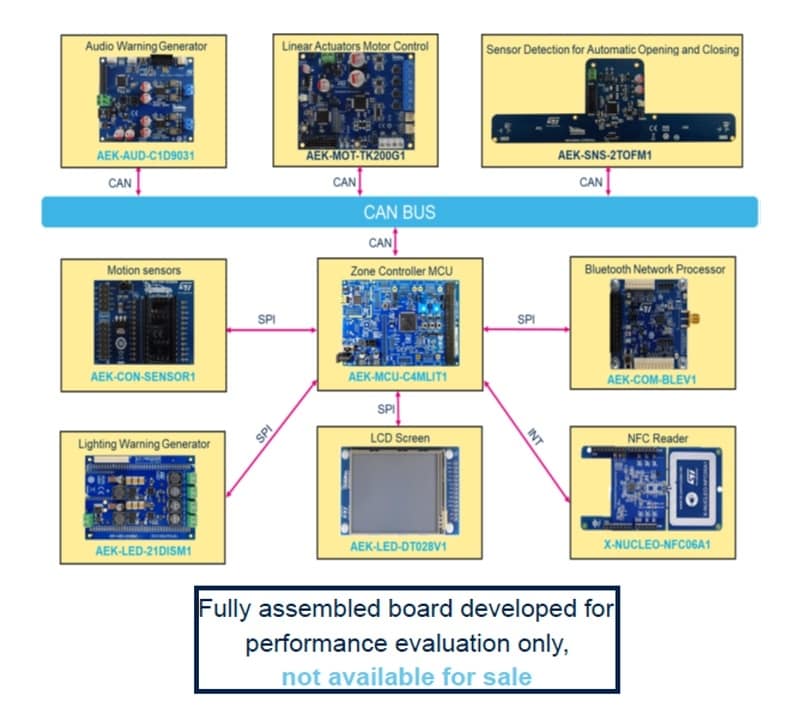 The AEKD-TRUNKL1 has been designed to address all these issues while increasing the system safety. Based on the newest zonal approach paradigm, this ST power liftgate system controls seven subsystems in parallel: acoustic and visual alerts, NFC and Bluetooth® Low Energy communication, motion and foot detection sensors, and linear actuator control. An LCD screen and a fail-safe button control are also available.