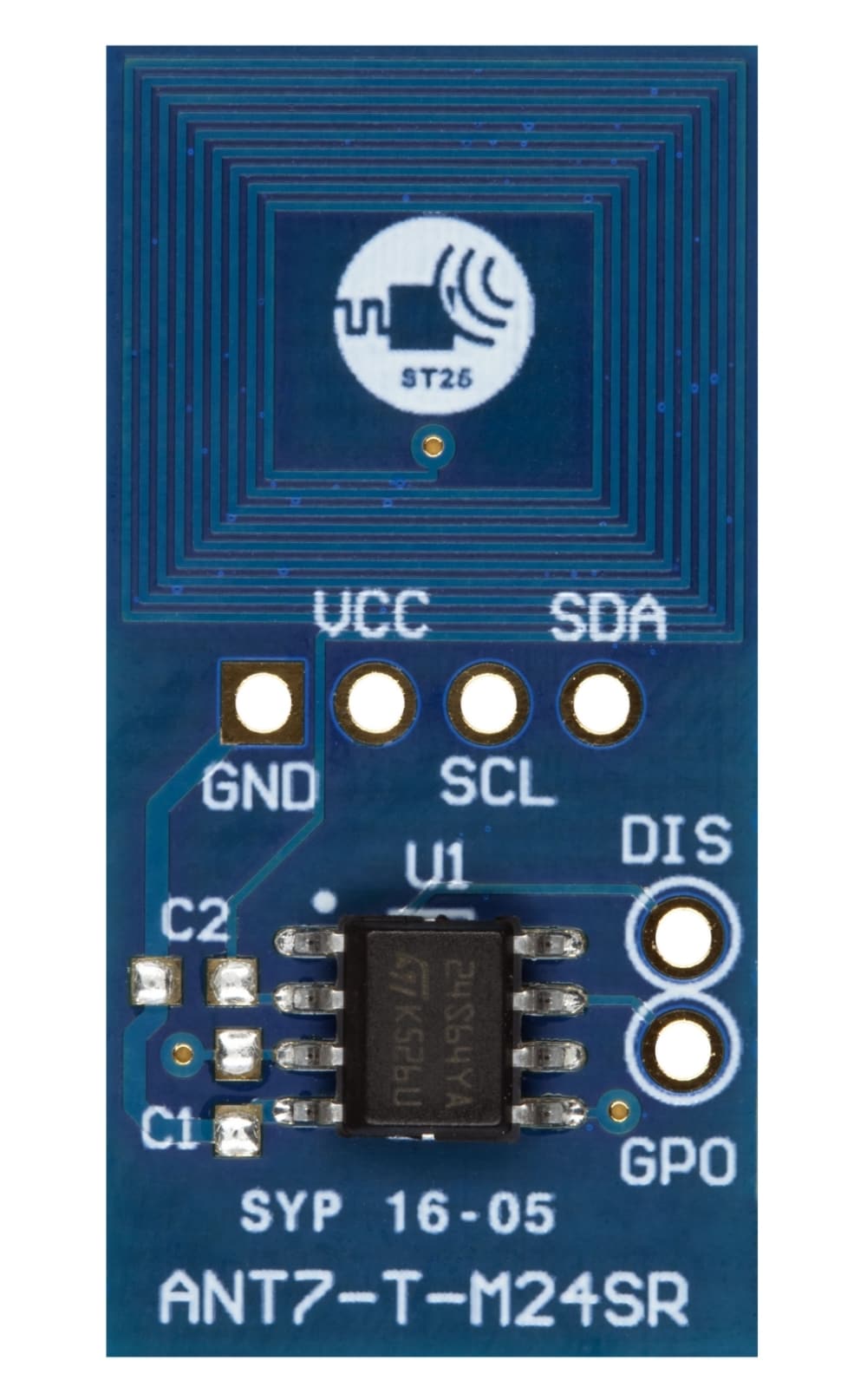 The ANT7-T-M24SR64 antenna reference board is a ready-to-use PCB featuring an M24SR64-Y dual interface EEPROM connected to a 14 mm x 14 mm, 13.56 MHz etched RF double layer antenna on one side, and to an I2C bus on the other side.