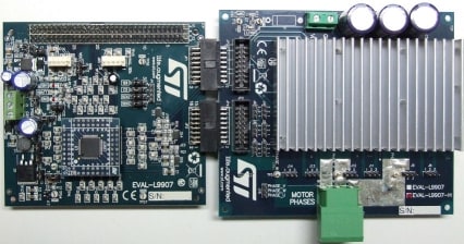 The EVAL-L9907-H is designed to provide the user with a platform for the evaluation of the L9907 device. The Board provides all the main input/output capabilities necessary to drive a BLCD motor and provide also diagnostic functionalities. L9907 is fully integrated 3-phase pre-driver with integrated booster capable to drive all kind of Power MOS transistors in 3-phase BLDC motor applications up to 54 V. The integrated boost regulator provides sufficient gate charge to driver Power MOS down to 6 V. The circuit is suitable to operate in environments with high supply voltage such as double battery in 48V systems.L9907 is able to control independently the six pre-driver channels to implement all kind of electric motor control strategies, with the possibility to select among 4 gate output current levels while the application is running. All output channels are protected against short circuit.L9907 is equipped with 2 current sense amplifiers. The gain and output offset voltage of each current sense amplifier can be configured by SPI to allow max flexibility for phase or ground current sense strategy. L9907 is protected against over-temperature and shoot through events.The EVAL-L9907-H can be plugged directly to SPC560P-DISP Discovery+ board and using the L9907 demonstration software it is possible to implement a 3 phase brushless motors control.