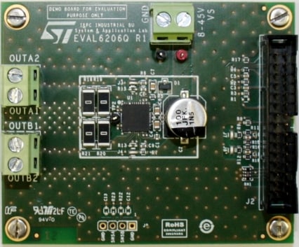 The EVAL6206Q demonstration board allows the user to test the L6206Q functions. The dual full bridges integrated into the L6206Q device can be used to drive a single 2-phase stepper motor or up to four DC motors (unidirectional). The bridges can also operate in parallel mode. The board can be driven using the STEVAL-PCC009V2 demonstration board and the PractiSPIN 2 evaluation software.