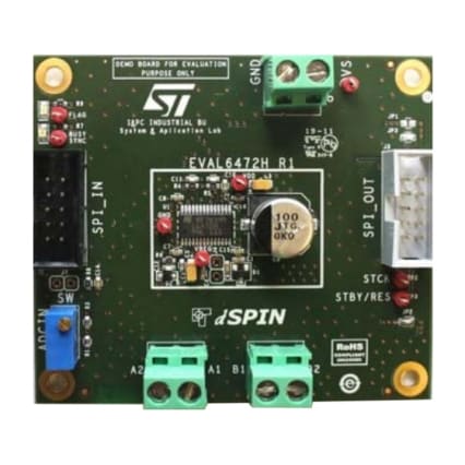 The EVAL6472H demonstration board is a fully integrated microstepping motor driver. In combination with the STEVAL-PCC009V2 communication board and the dSPIN evaluation software, the board allows the user to investigate all the features of the L6472 device. In particular, the board can be used to regulate the L6472 parameters in order to fit application requirements.