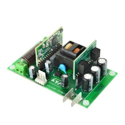 This demonstration board is a resonant LLC converter for industrial applications providing minimum size and very high efficiency. It can be used as a DC-to-DC converter or as part of a more complex system using a front-end preconditioner such as a PFC. The board is based on the STNRG599A, a new resonant tank controller implementing the novel phase-shift control method, and on MASTERGAN1L, embedding a GaN transistor-based half-bridge leg and corresponding drivers in the same package. This allows direct interfacing with any kind of SMPS controller.