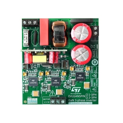 The EVLGANSPIN1-3PH is a three-phase inverter based on the GANSPIN611 half-bridge GaN system-in-package (integrating 138 mΩ 650 V e-mode HEMT GaN and the gate driver with LDOs, bootstrap diode, overcurrent protection) and the STM32G431RB with Arm Cortex®-M4 MCU at 170 MHz with 128 Kbytes of Flash memory, Math Accelerator.