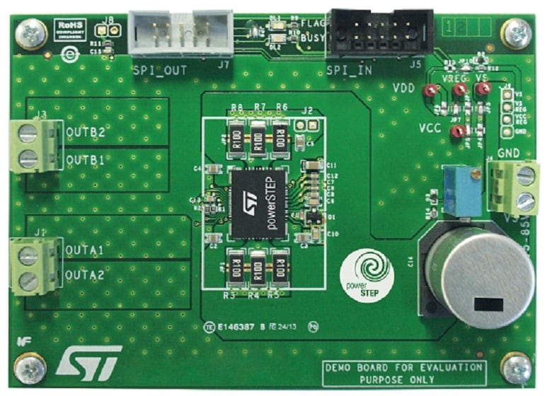 The EVLPOWERSTEP01 demonstration board is a microstepping motor driver delivering up to 10 Ar.m.s.. In combination with the STEVAL-PCC009V2 communication board and the evaluation software, the board allows the user to investigate all the features of the powerSTEP01. In particular, the board can be used to check the performance and to regulate the parameters in order to fit the application requirements.