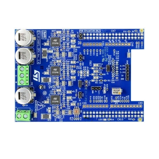 The board can be stacked with an X-NUCLEO MCU control board through ST morpho connectors and drive BLDC/PMSM motors exploiting off-the-shelf firmware libraries.