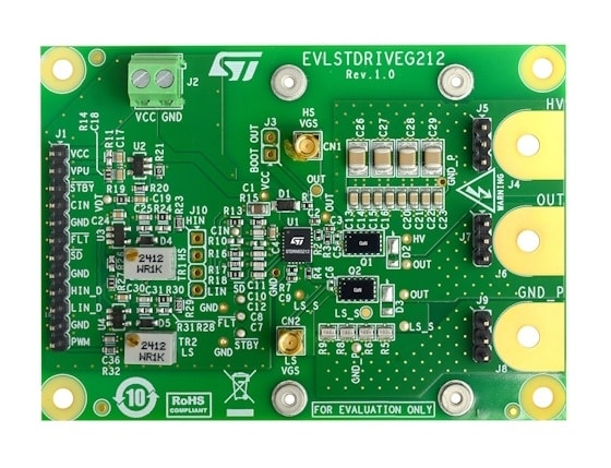 The EVLSTDRIVEG212 board is easy to use, as well as quick and suitable for evaluating the characteristics of the STDRIVEG212 driving two 2.2 mΩ typ., 100 V e-mode GaN switches in a half-bridge configuration. The STDRIVEG212 comes in a 4x5 mm QFN package, while GaN switches are in a 3x5 mm En-FCQFN package. The EVLSTDRIVEG212 board is also suitable for evaluating the STDRIVEG612 features.