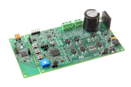 The EVSPIN32F02Q1S1 board is a 3-phase complete inverter based on the STSPIN32F0251 controller, which embeds a 3‑phase 250 V gate driver and a Cortex®-M0 STM32 MCU. The power stage features STD17NF25 MOSFETS, but can be populated with any IGBT or Power MOSFET in DPAK or powerFLAT 6x5 package. The board has a single-shunt sensing topology, and both sensored and sensorless FOC and 6‑step control algorithms can be implemented. This allows driving permanent magnet synchronous motors (PMSMs) and brushless DC (BLDC) motors.