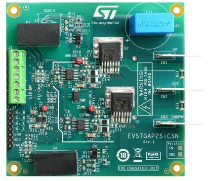 The EVSTGAP2SICSNC is a half bridge evaluation board designed to evaluate the STGAP2SICSNC isolated single gate driver.