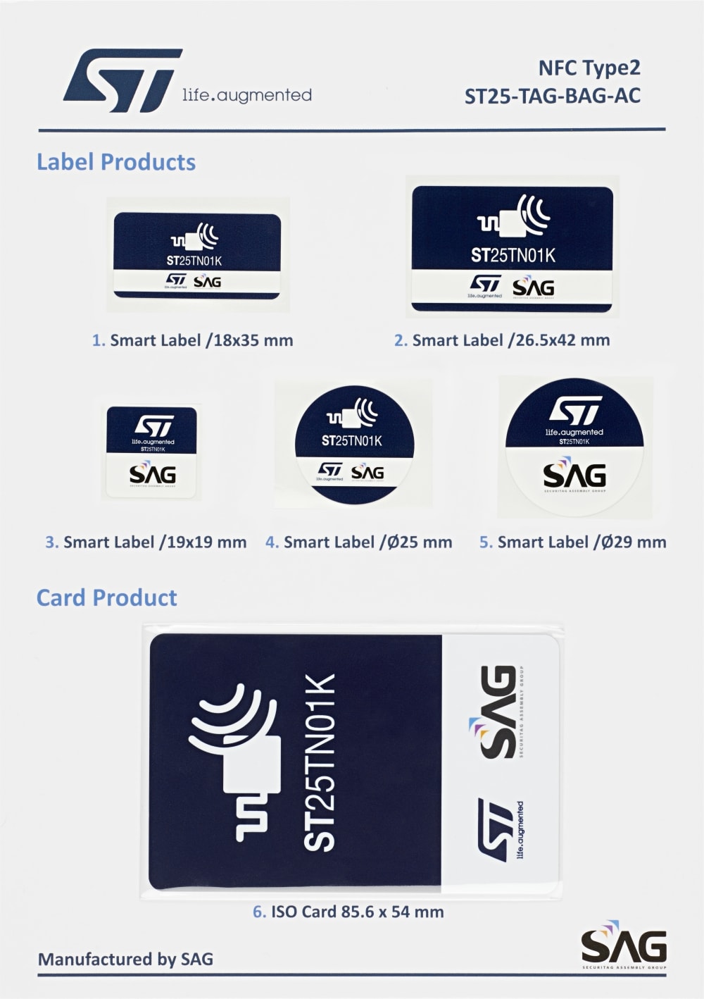 The ST25-TAG-BAG-AC is a ready-to-use tag set, containing tags based on NFC Forum Type 2 (ST25TN01K) tag ICs. These ICs are combined with antennas of different size and material, to address different applications.