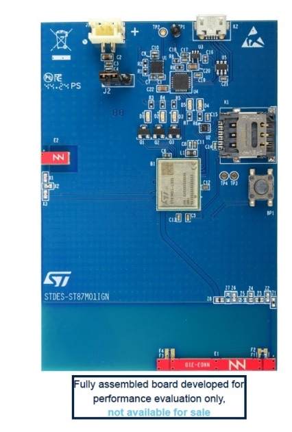 The STDES-ST87M01IGN includes all necessary functions for fast evaluation: USB or battery powering, low‑noise voltage regulation, USB‑to‑UART interface, SIM holder, reset button, status LEDs, and accessible test points.