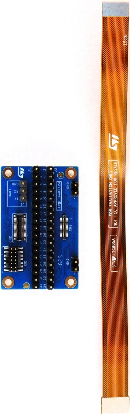 The STEVAL-C34ADPTK1 kit includes the STEVAL-C34ADPT2 adapter board and the STEVAL-FLTCB05 flex cable, measuring 15 cm in length, to ensure reliable connections.