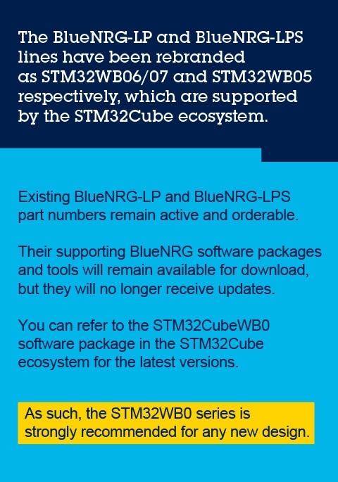 - Associated BlueNRG-LP development kit software package (STSW-BNRGLP-DK) including firmware and documentation