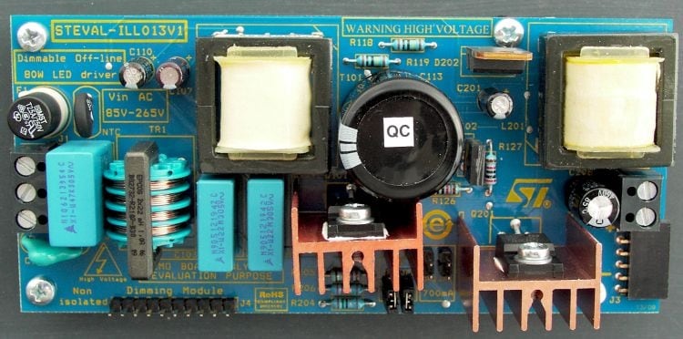 The STEVAL-ILL013V1 demonstration board is an 80 W offline dimmable LED driver with high power factor (PF) intended for 350 mA, 700 mA and 1 A LEDs.