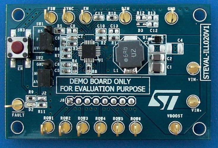 This demonstration board is based on the LED7706 and implements a high efficiency monolithic boost converter and six controlled current generators (rows) specifically designed to supply LEDs arrays used in the backlight of LCD panels.